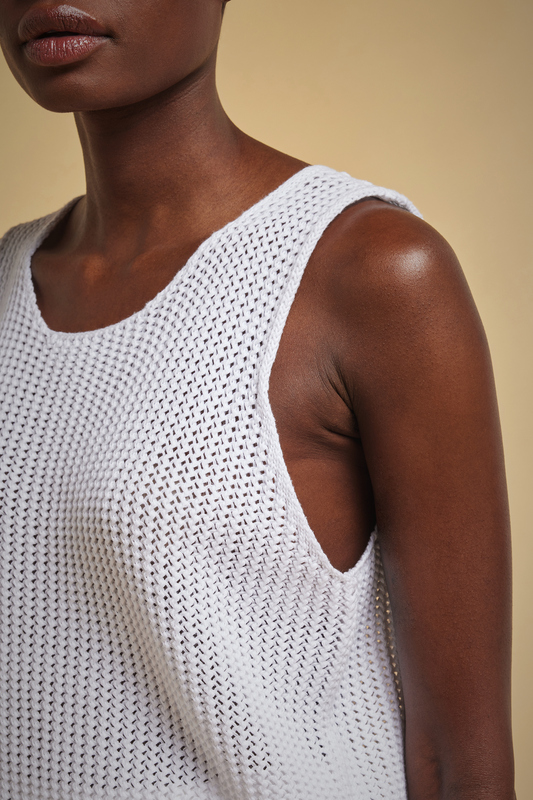 Top de algodón teñido por inmersión, cuello redondo, sisas y bajo con dobladillo y flecos.