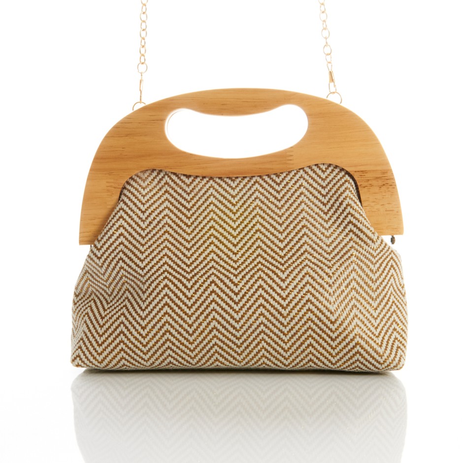 Cartera - clutch con forma cuadrada. Cierre en dos piezas de madera color clarito y tejido espiga.