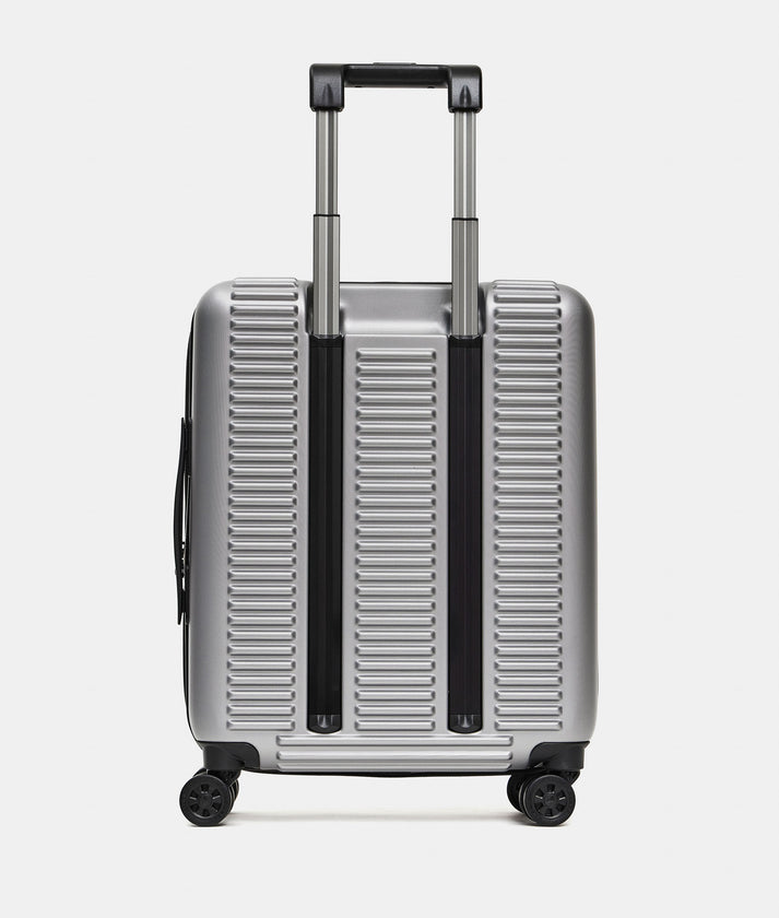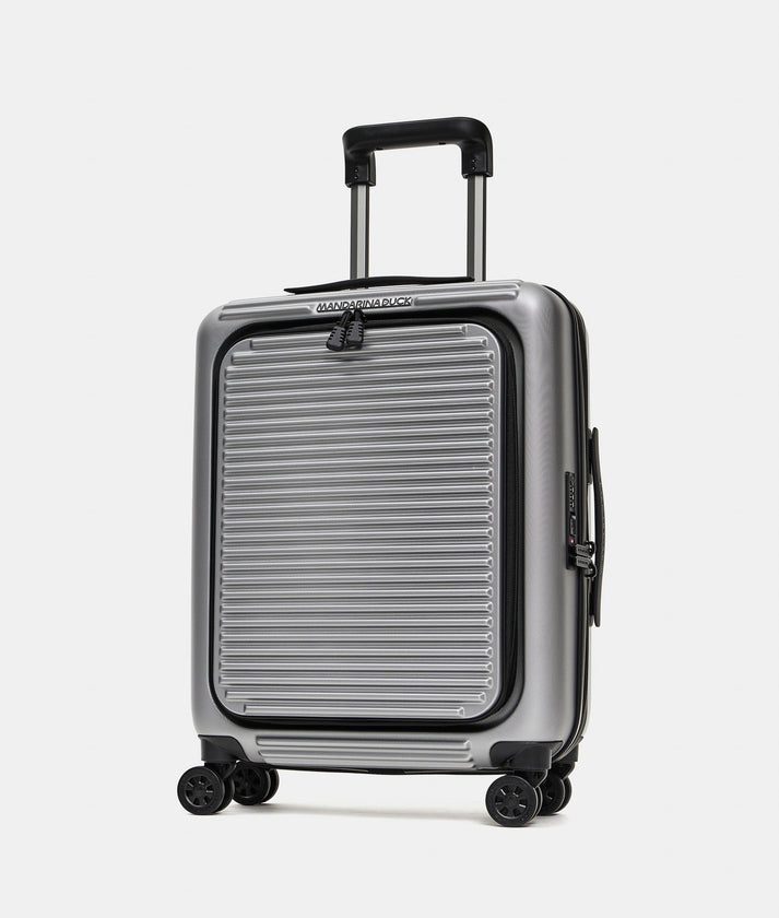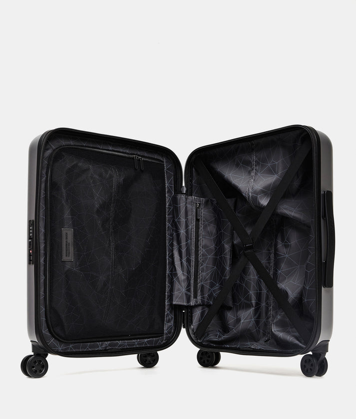 Maleta rígida con ruedas (4 ruedas) de 55 x 35 x 20 cm, tamaño cabina. Fabricada en policarbonato. Asa retráctil de varios niveles, cerradura TSA integrada, etiqueta con dirección, funda protectora y detalles personalizados.