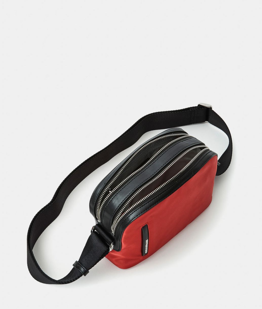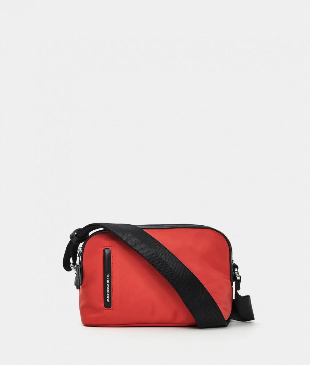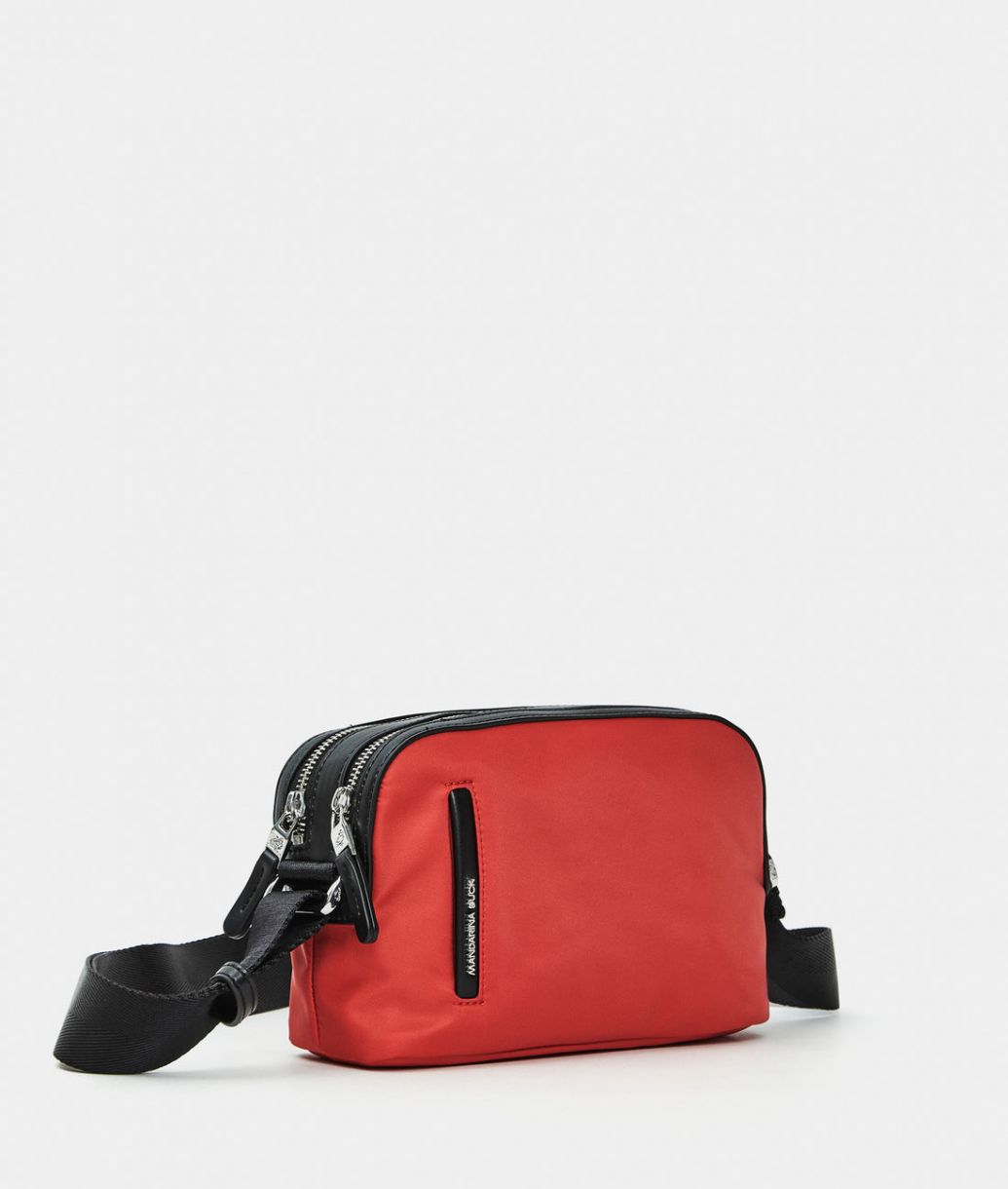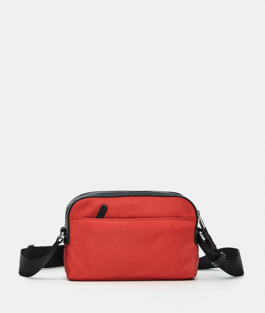 Bolso bandolera pequeño con doble compartimento y cremalleras de tela. Doble opción de transporte, prácticos bolsillos frontales, traseros e internos, detalles personalizados y correa ajustable de jacquard.