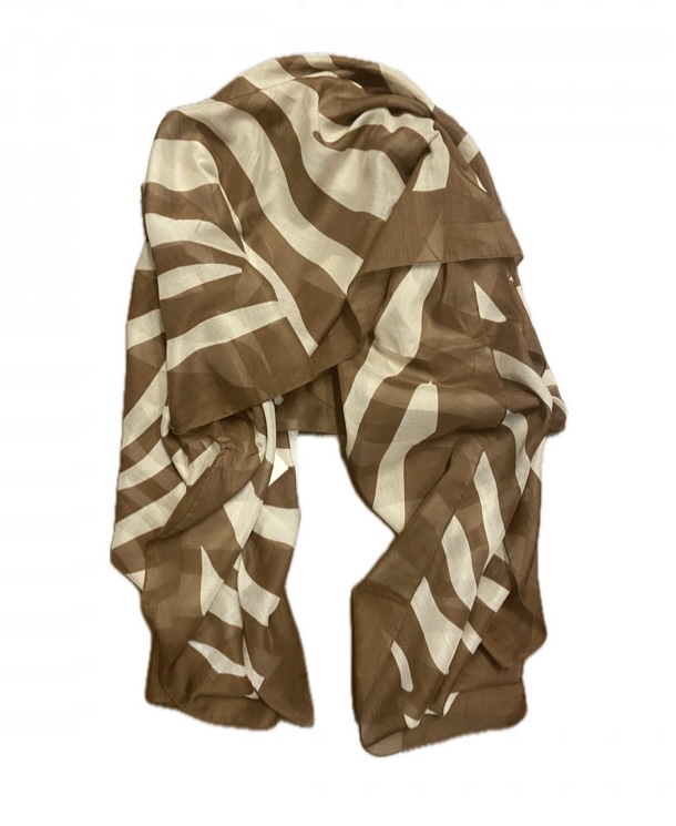 Pañuelo cuadrado, ligero y de tejido suave y agradable con estampado de cebra en tonalidades marrones.