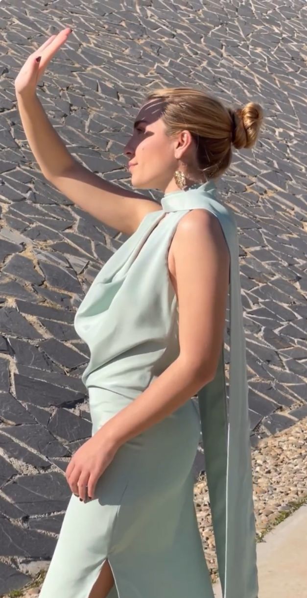 El escote en cascada aporta un toque romántico y suave, mientras que la espalda baja descubre lo justo para mantener el equilibrio entre sensualidad y sofisticación.