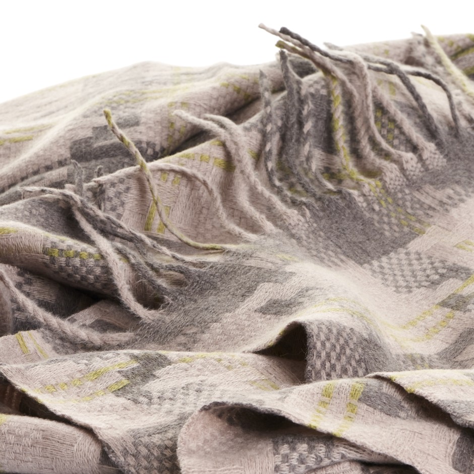 Bufanda con dibujo geométrico en tonos rosa y gris y terminación en flecos.