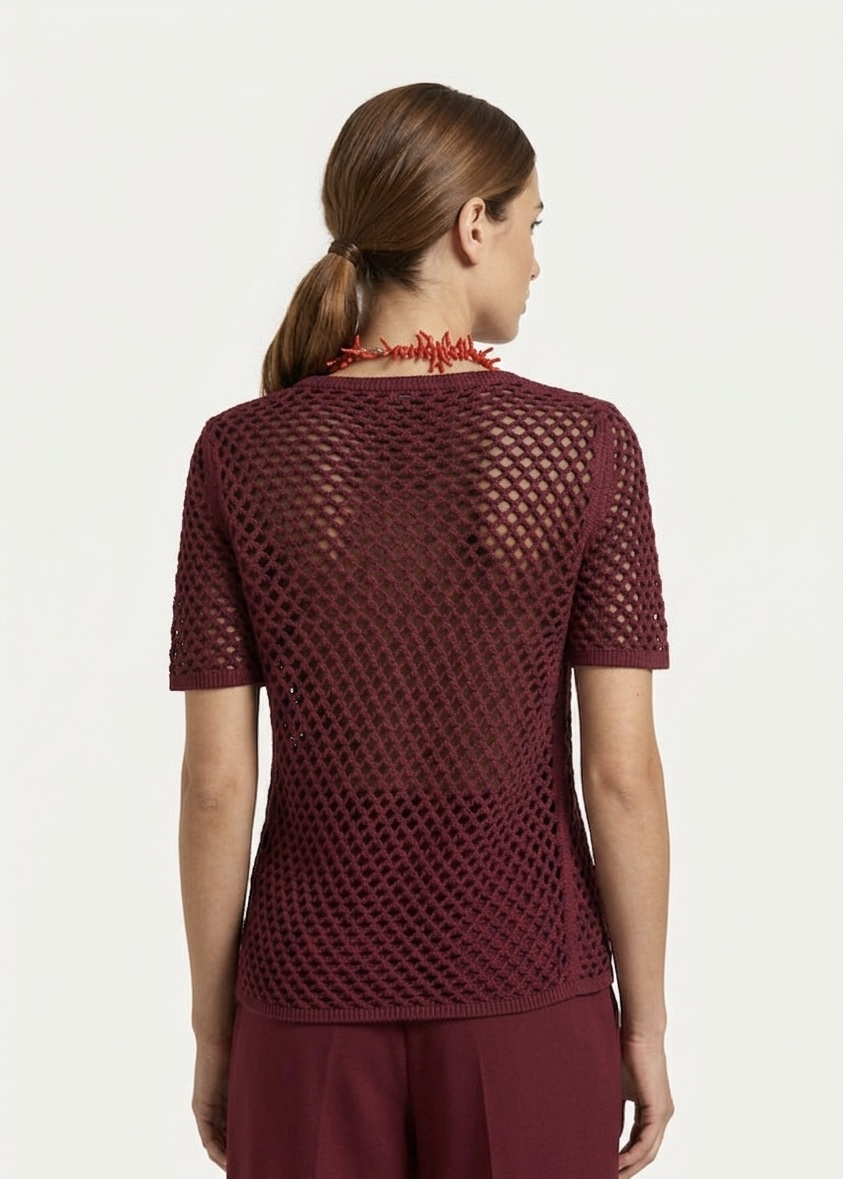 Jersey de punto calado 100% algodón teñido en prenda, con mangas cortas. Cuello redondo, silueta holgada, largo hasta las caderas.
