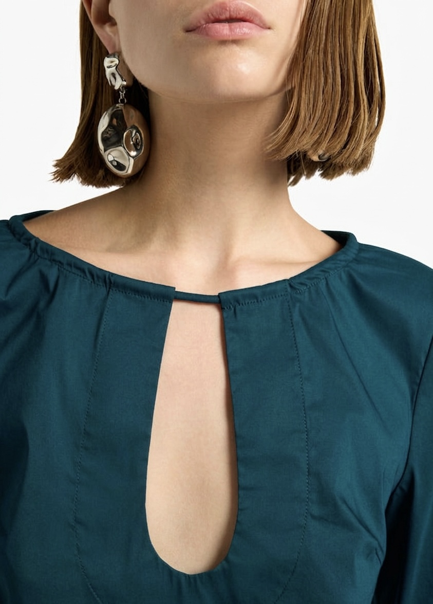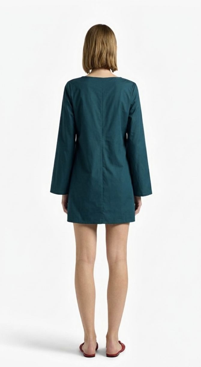 Minivestido de popelina elástica con mangas largas y anchas hasta el bajo. Escote barco con abertura frontal. Corte ligeramente acampanado.
