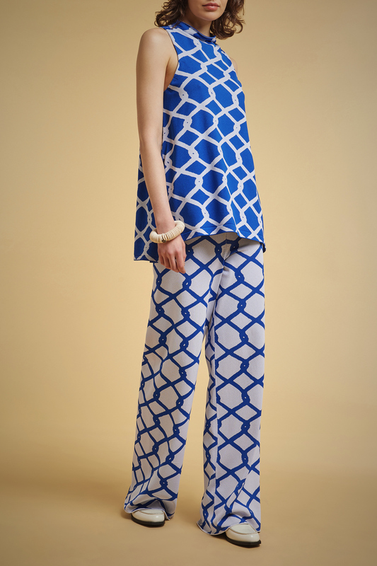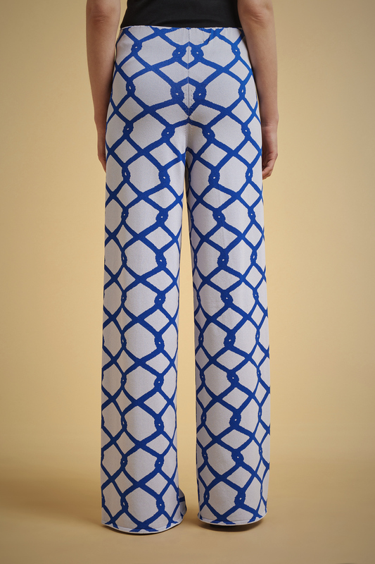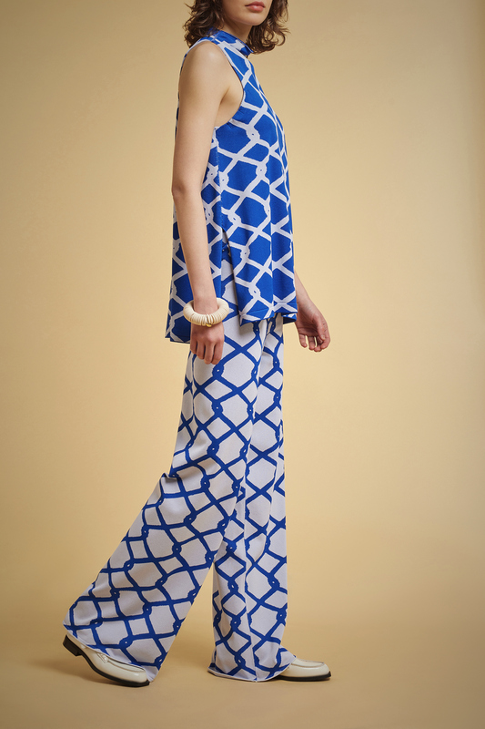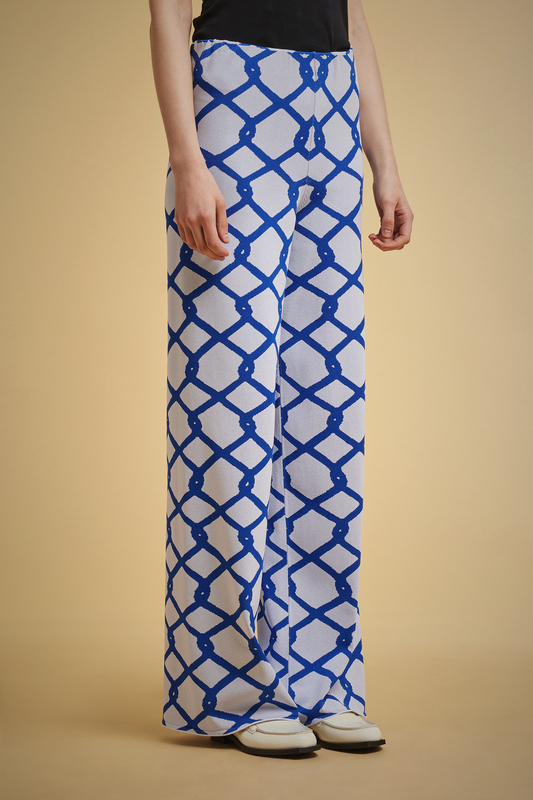Pantalón palazzo de viscosa elástica, estampado integral de jacquard y cintura elástica. Ajuste regular