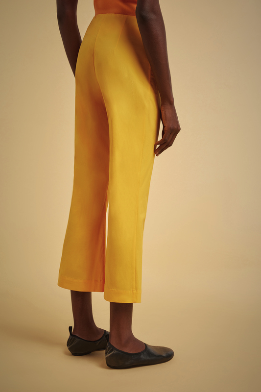 Pantalón trompeta en lona de algodón. Cintura interior elástica y bajo con dobladillo. Pliegue planchado en el centro de la pierna. Diseño ajustado. Ajuste regular