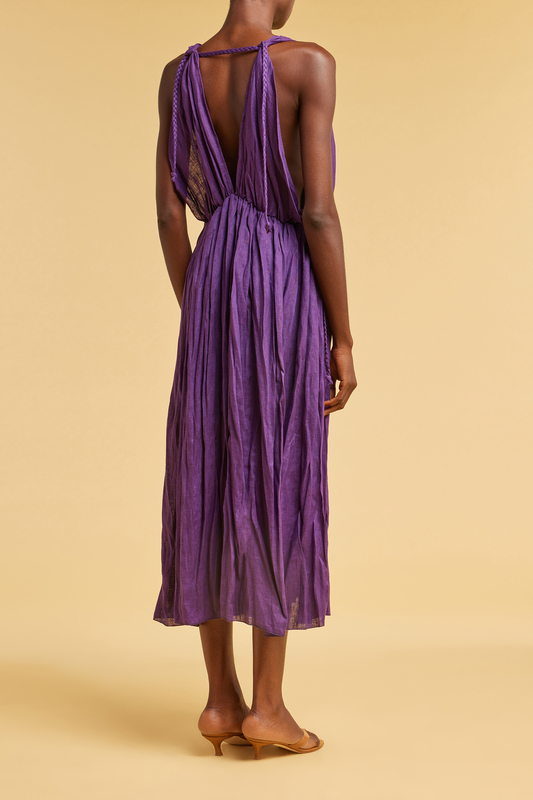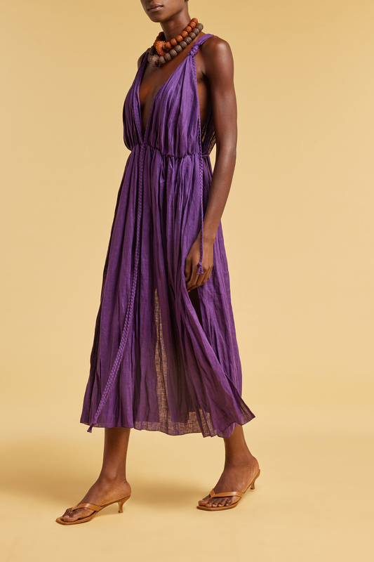 Vestido largo 100% lino, efecto plisado, escote en pico profundo con detalle de trenza, sisas, cintura marcada con cinturón trenzado, aberturas laterales en el bajo.