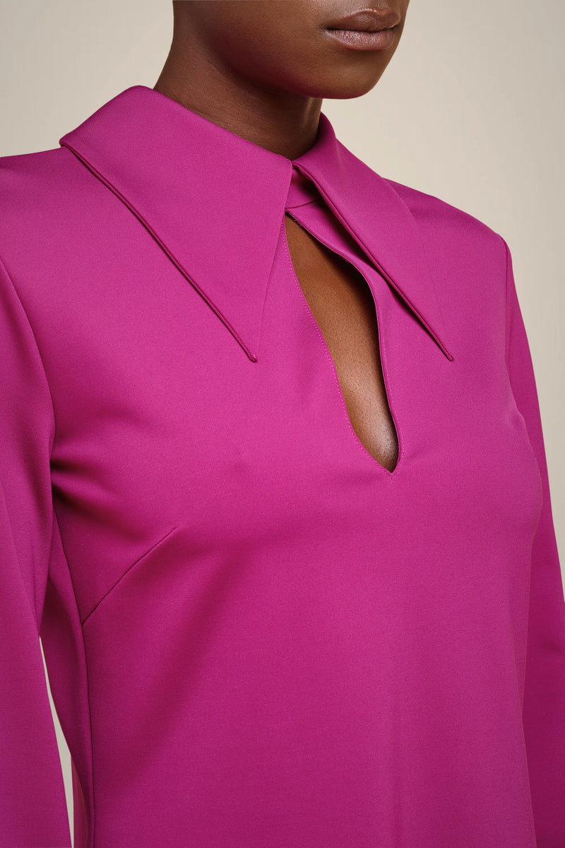 Blusa de punto milano brillante, cuello redondo con cuello y abertura caída en el centro delantero, mangas largas, abertura de cremallera en el centro trasero.