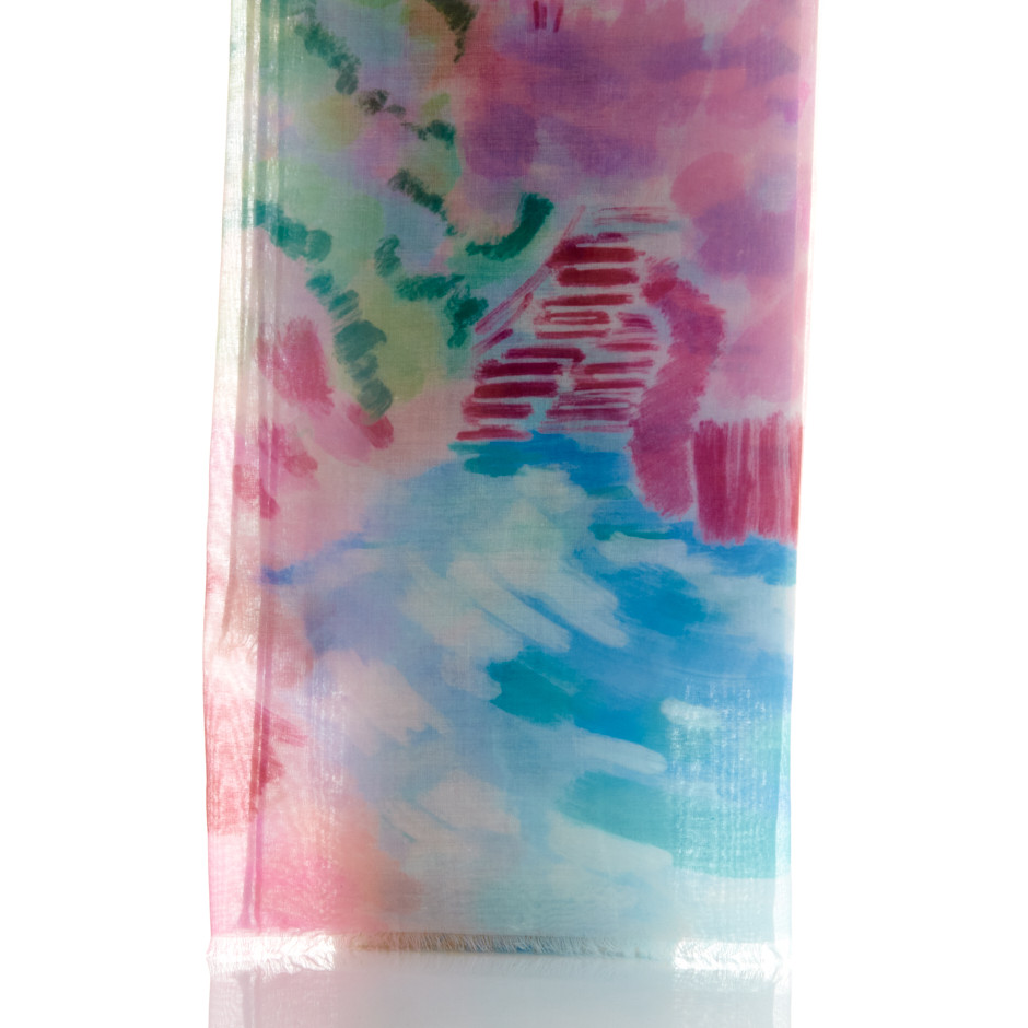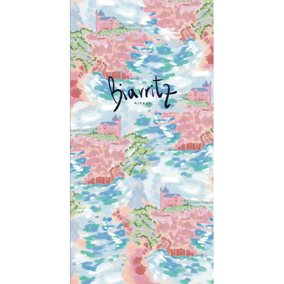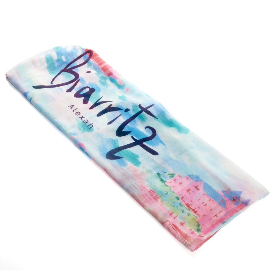 Pañuelo en estampado y diseño exclusivo ALEXAH. Diseño de la emblemática VILLA BELZA de Biarritz. Trazos multicolor.
