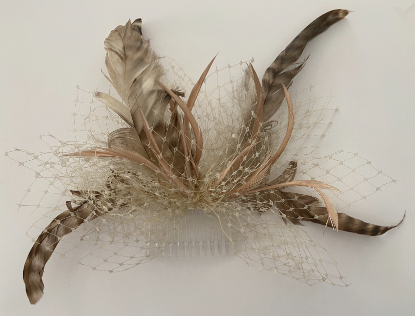 Peineta de púas transparentes con plumas moteadas en tonalidades beige.
