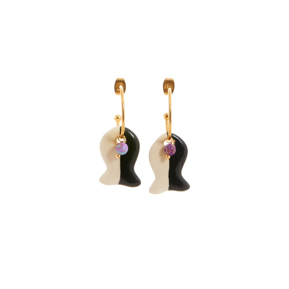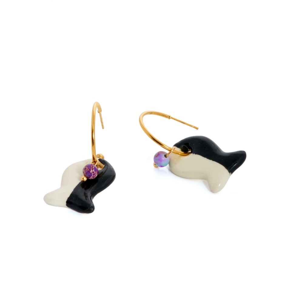 Piezas artesanales hechas a mano por la ceramista Sonia Roda. Tamaño pez: 2 cm. Diámetro aro: 2 cm. Composición: acero hipoalergénico. Cerámica esmaltada.
